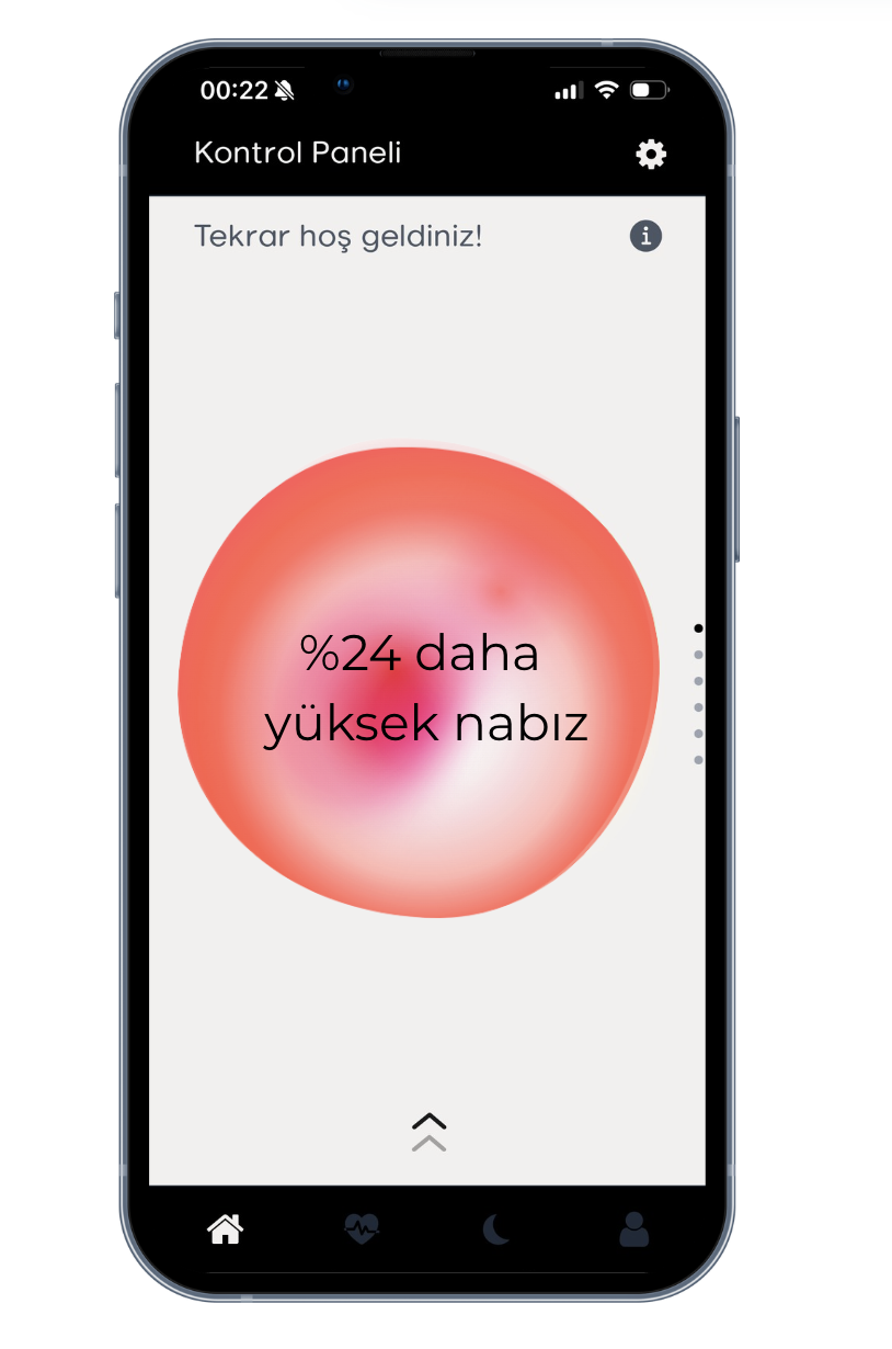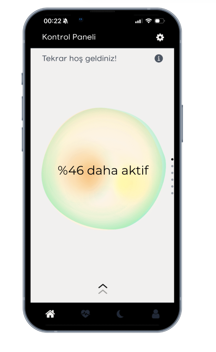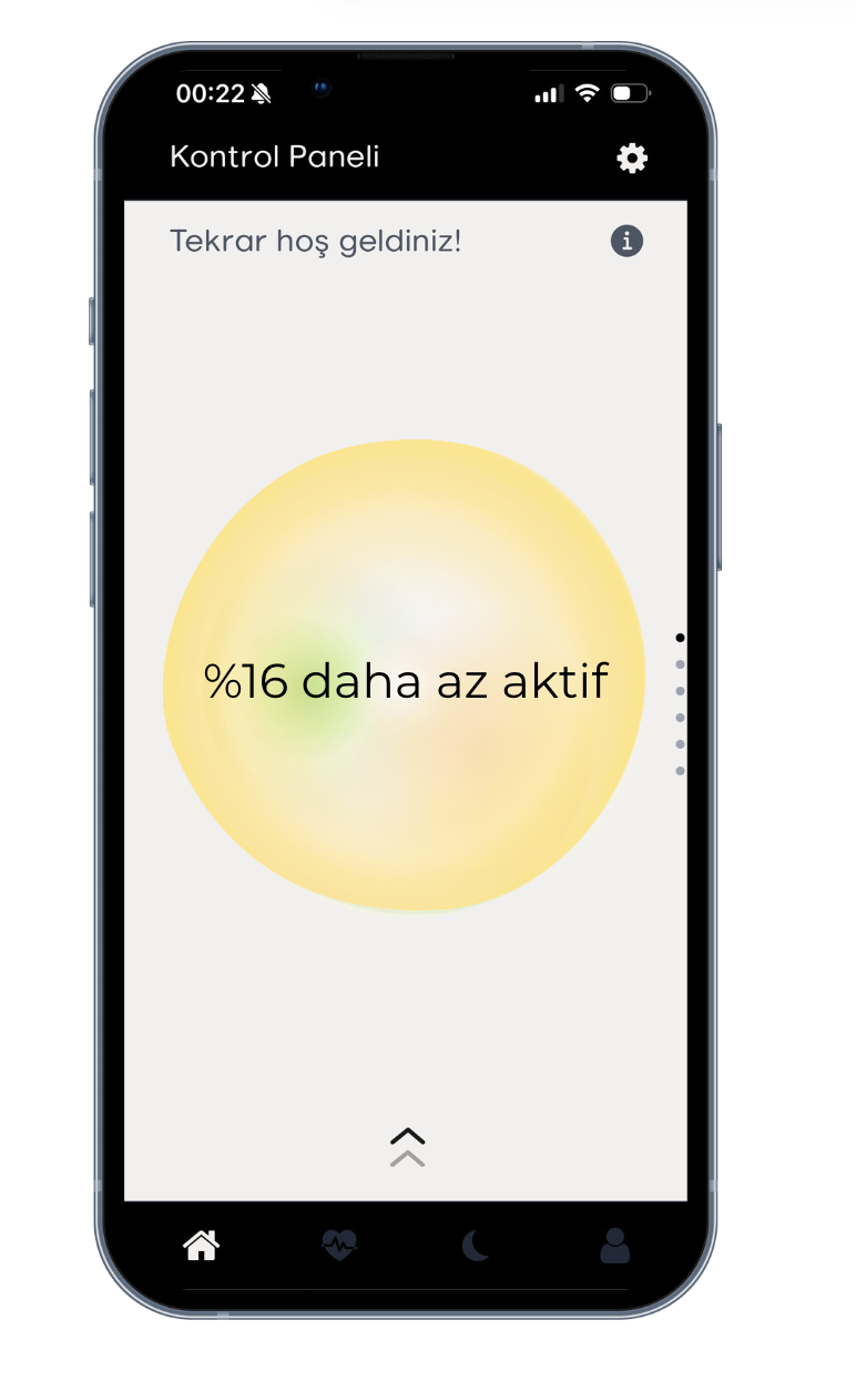 Günlük durum baloncuğu size algoritmadaki en önemli veriyi sunar. Hayatın akıştan ibaret olduğunu benimseyerek an’ı bölmeden, fonksiyondaki en önemli veri akışı anasayfadaki baloncukta sizi karşılar. Hedefe ulaşmış adım sayısı, artan kalp ritmi, azalmış bir stres, sakin bir beden analizi bu baloncukta hayat bulur.