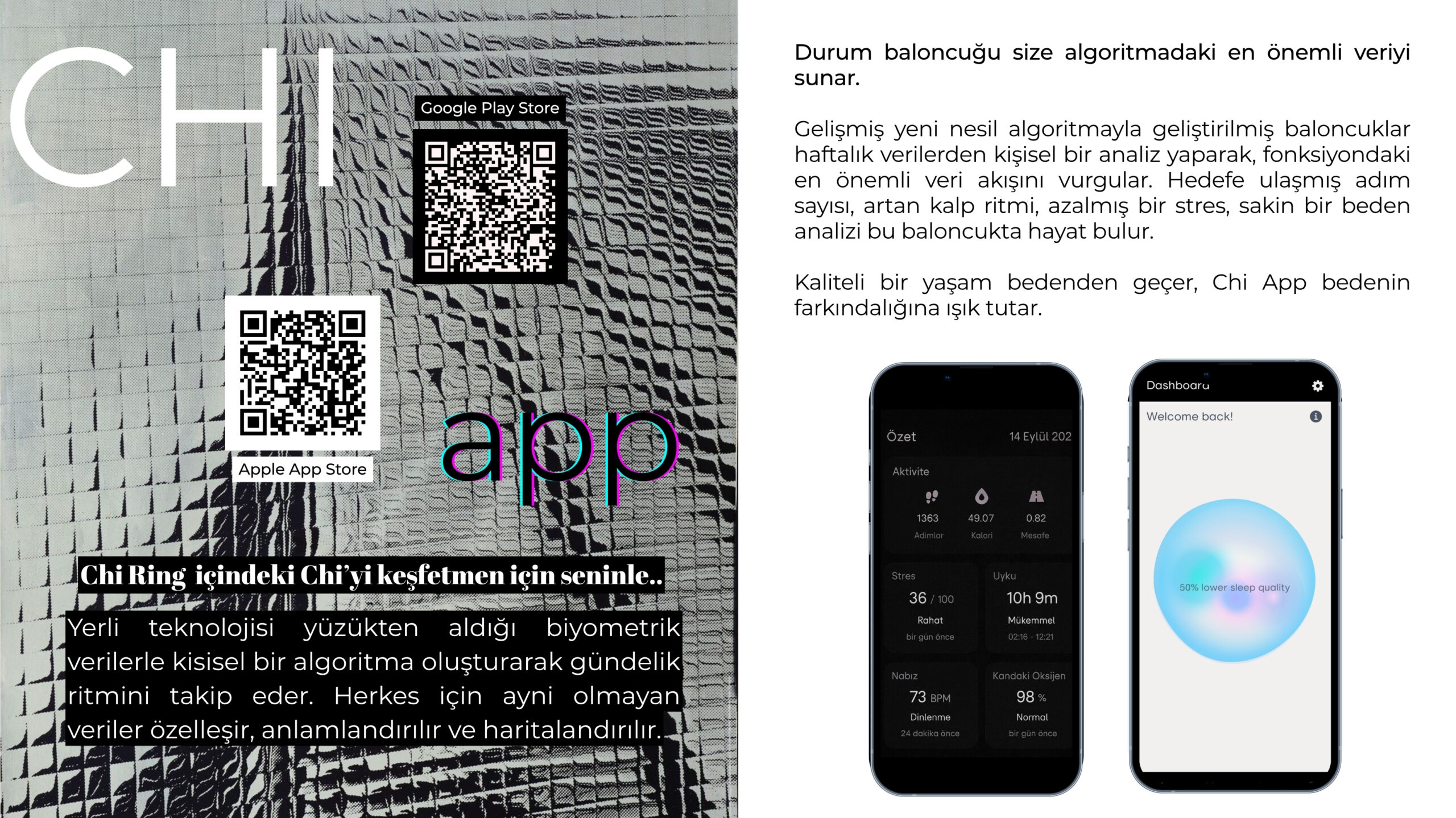 Yerli teknolojisi yüzükten aldığı verilerden senin adına bir algoritma oluşturarak gündelik hayatını takip eder. Herkes için aynı olmayan veriler özelleşir, anlamlandırılır ve haritalandırılır. Limitler belirlenir ve hatrlatılır. Aktivite ve spor hedefleri isteğiniz doğrultusunda haırlatılır veya takip edilir.. Bazı adımlar zihinseldir, bazılari ise fiziksel. Chi hedeflerinizin takibinde, en minimal haliyle içinizdeki Chi’yi keşfetmen için seninle..